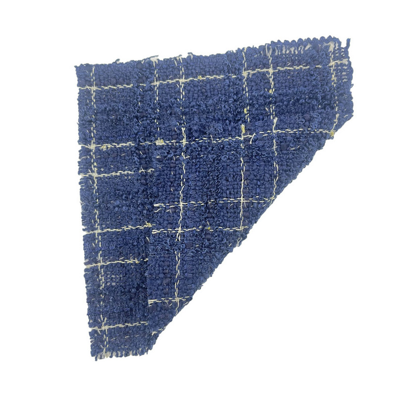 Această țesătură, desemnată ca articol 19909-10, este un tweed 100% poliester conceput pentru îmbrăcămintea pentru femei. Cu o masă pe unitatea de suprafață de 558g/m, prezintă o structură de greutate medie. Baza albastru închis este țesută cu model în carouri, integrată cu fire metalice în timpul procesului de fabricație. Această combinație creează un contrast atât în ceea ce privește proprietățile vizuale, cât și cele tactile. Compoziția integral din poliester asigură stabilitate dimensională și performanță constantă. Includerea elementelor metalice adaugă detalii care reflectă lumina suprafeței textile. Aceste caracteristici fac ca materialul să fie potrivit pentru articolele de îmbrăcăminte în care integritatea structurală și efectul decorativ sunt prioritare.