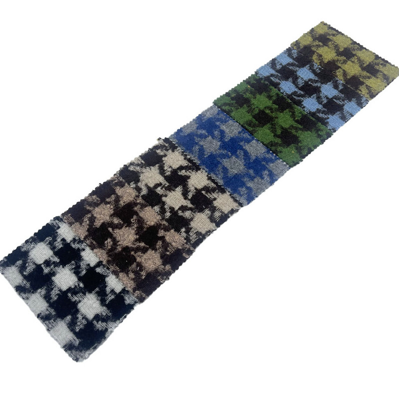 Această țesătură, desemnată ca articolul 2882, este un material textil jacquard tweed compus din 10% lână și 90% alte fibre. Cu o masă pe unitate de suprafață de 600 g/m, prezintă o construcție grea. Suprafața combină un model din picioare de hound cu elemente în carouri prin procesul de țesut jacquard. A fost aplicat un finisaj prin periere pentru a crea o textură înălțată, asemănătoare unui pluș, formând o suprafață densă, cu grămadă scurtă. Această tehnică modifică atât profunzimea vizuală, cât și proprietățile tactile ale țesăturii, menținând în același timp precizia geometrică a modelelor țesute. Compoziția amestecului de lână contribuie la rezistența materialului și la izolarea termică. Aceste caracteristici tehnice fac din această țesătură aplicabilă proiectelor care necesită atât definirea modelului complex, cât și textura distinctivă a suprafeței.