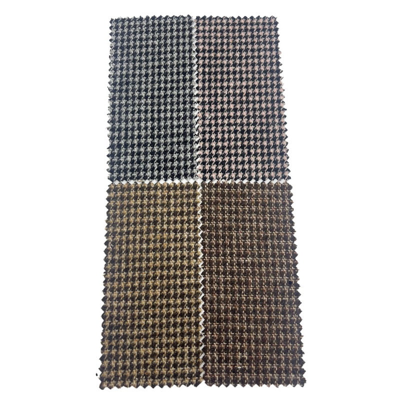 Această țesătură, desemnată ca articolul 4334, este un material textil tweed țesut compus din 35% lână și 65% alte fibre. Cu o masă pe unitatea de suprafață de 450 g/m, prezintă o construcție cu greutate medie. Suprafața combină un model din picioare de hound cu elemente de check, creând un design geometric compozit prin tehnici precise de țesut. Această metodă de construcție produce carouri rupte interconectate cu un contrast de culoare definit pe țesătură. Compoziția amestecului de lână contribuie la stabilitatea dimensională și rezistența la riduri a țesăturii. Aceste caracteristici tehnice au ca rezultat un material cu articulație complexă a modelului și durabilitate structurală, făcându-l aplicabil pentru pantaloni în care sunt necesare modele detaliate și performanțe pe termen lung.